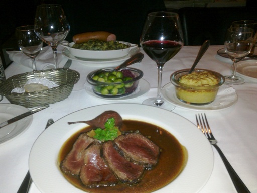 De Europese hertenrug filet die wat verfijnder van smaak is dan de Nieuw-Zeelandse was mooi rosé gebakken. Het malse vlees had een heerlijke ietwat kruidige wildsmaak en werd geserveerd met in kaneel gestoofde pompoen, wildsaus, aardappelpuree, rode kool en spruitjes.